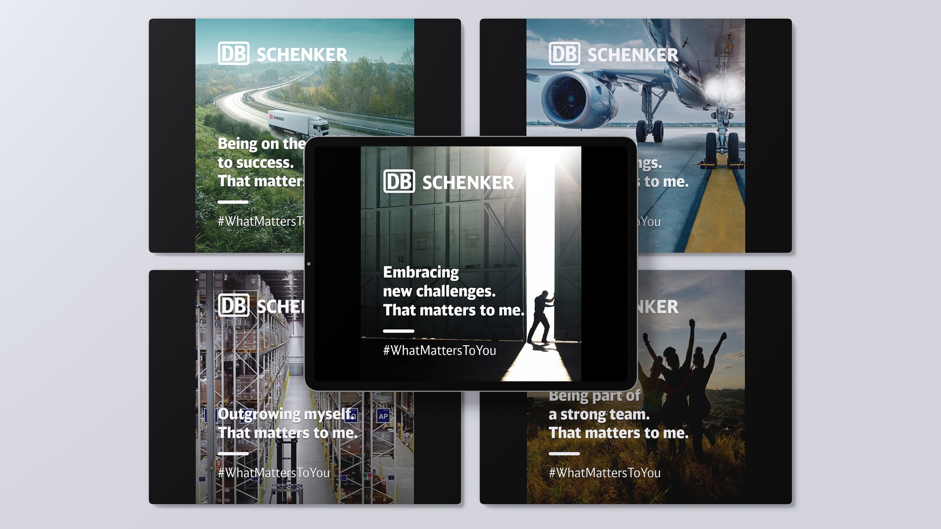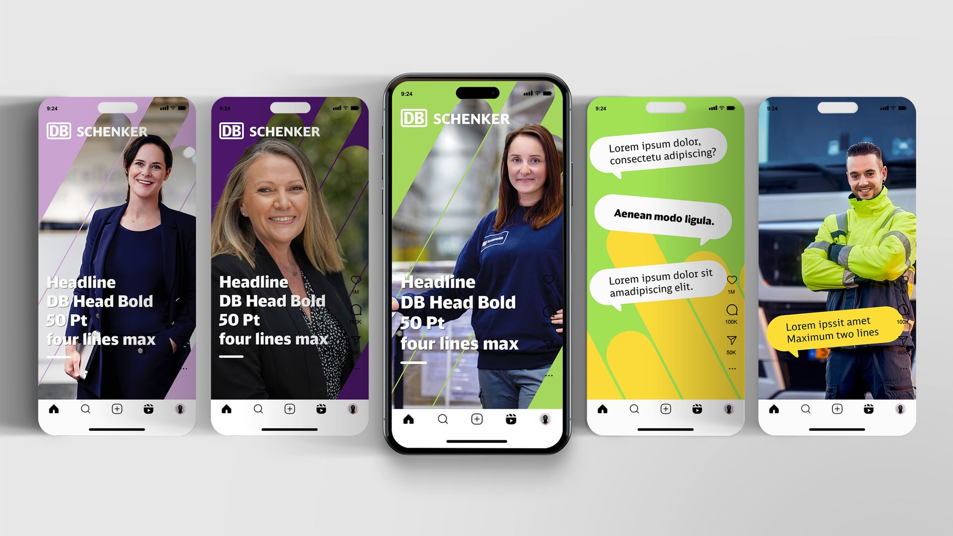 Im Rahmen eines neuen Employer Brandings hat sich DB Schenker als Arbeitgebermarke neu und charakteristisch in den sozialen Medien positioniert. Dabei sollen diverse Zielgruppen wie Student:innen, Akademiker:innen und Professionals angesprochen werden. Das Mittel der Wahl: PowerPoint Templates für Postings in sozialen Medien. Sie sind einfach zu bearbeiten und international einsetzbar - perfekt für einen global einheitlichen Auftritt. Das Ergebnis ist eine Auswahl an gestalteten und animierten Layouts zur Erstellung individueller Video- und Bildinhalte für Facebook, Instagram, LinkedIn und X (vorher Twitter).