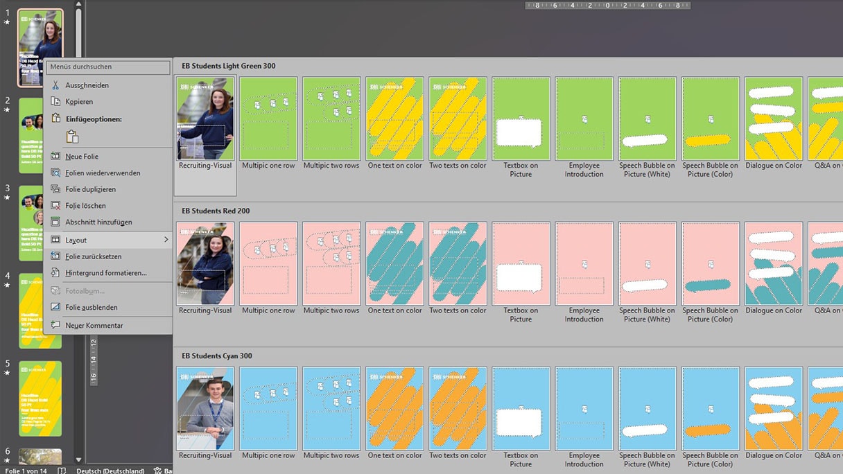 Die Layouts wurden in PowerPoint mit unterschiedlichen Farbschemata aufgebaut, damit die Bereiche Employer Branding und Talent Marketing ihre Zielgruppen konsistentundeinzigartig ansprechen können. Das Template-Design ist bold, bunt und am Puls der Zeit. Damit unterstreicht es die Positionierung der Arbeitgebermarke DB Schenker und ist zugleich optimiert für aktuelle Sehgewohnheiten in den sozialen Medien. Zusätzlich haben wir das Design für unterschiedliche Plattformen und Formate adaptiert, um eine kohärente und effektive Darstellung sicherzustellen.