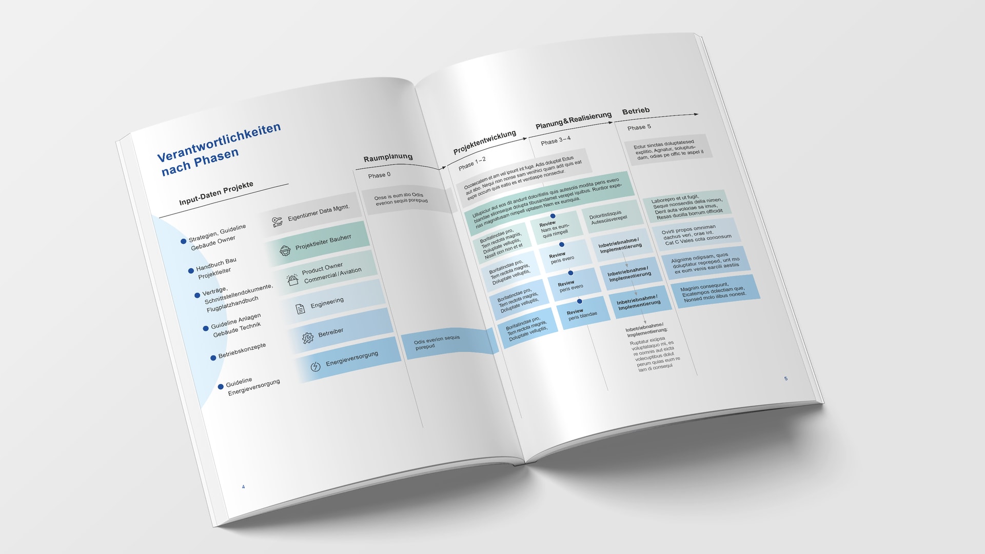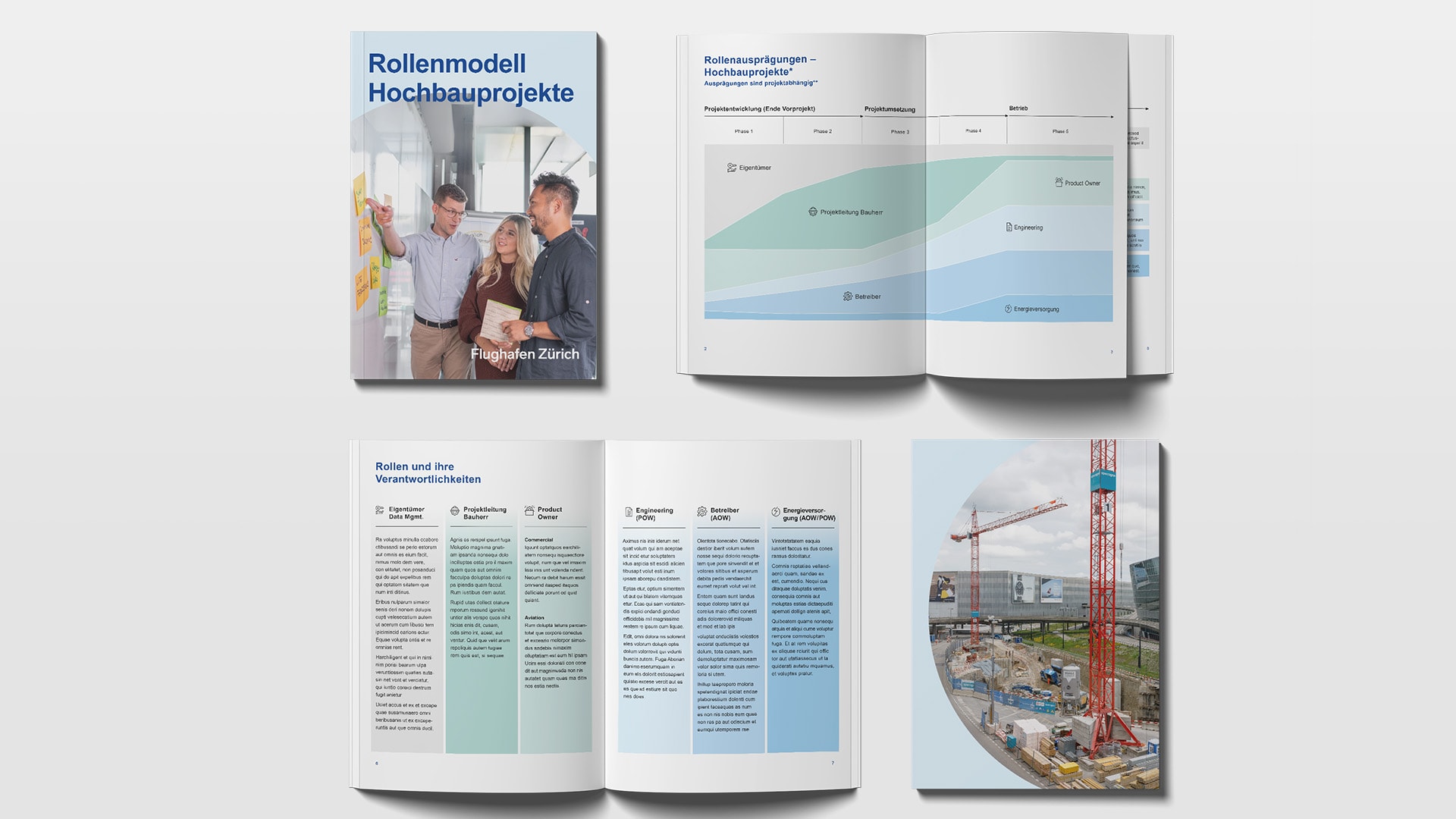In komplexen Immobilienprojekten mit vielen Beteiligten ist ein gemeinsames Rollenverständnis entscheidend. Für die Flughafen Zürich AG entwickelte K16 eine Broschüre, die genau das schafft: Klarheit über Aufgaben, Zuständigkeiten und Projektphasen – visuell strukturiert und farblich codiert.