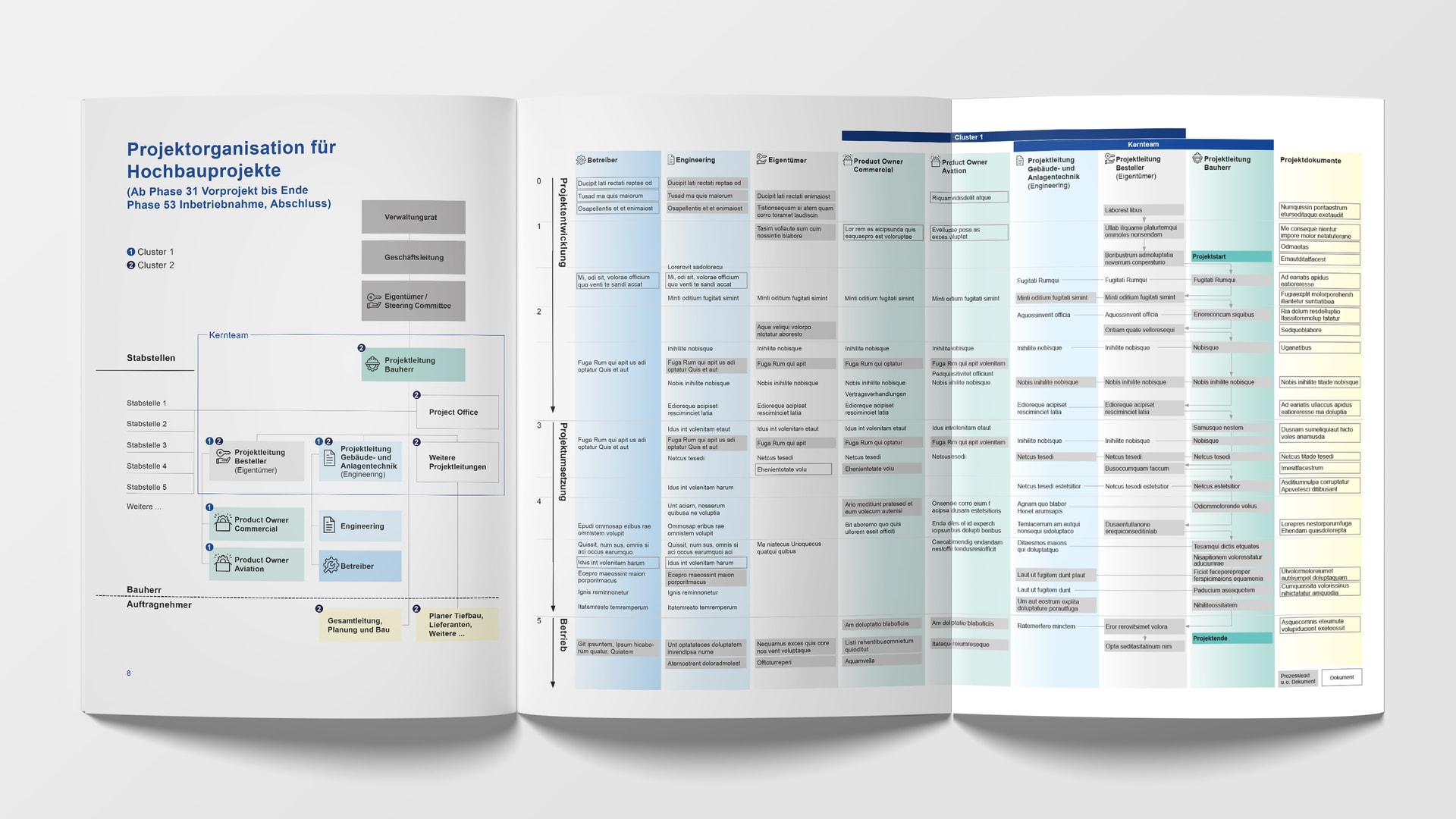 Ein ausklappbarer Projektplan im Rückcover zeigt den gesamten Ablauf auf einen Blick. Die Broschüre erscheint digital und gedruckt und dient als Grundlage für effiziente Zusammenarbeit und erfolgreiche Projektsteuerung.