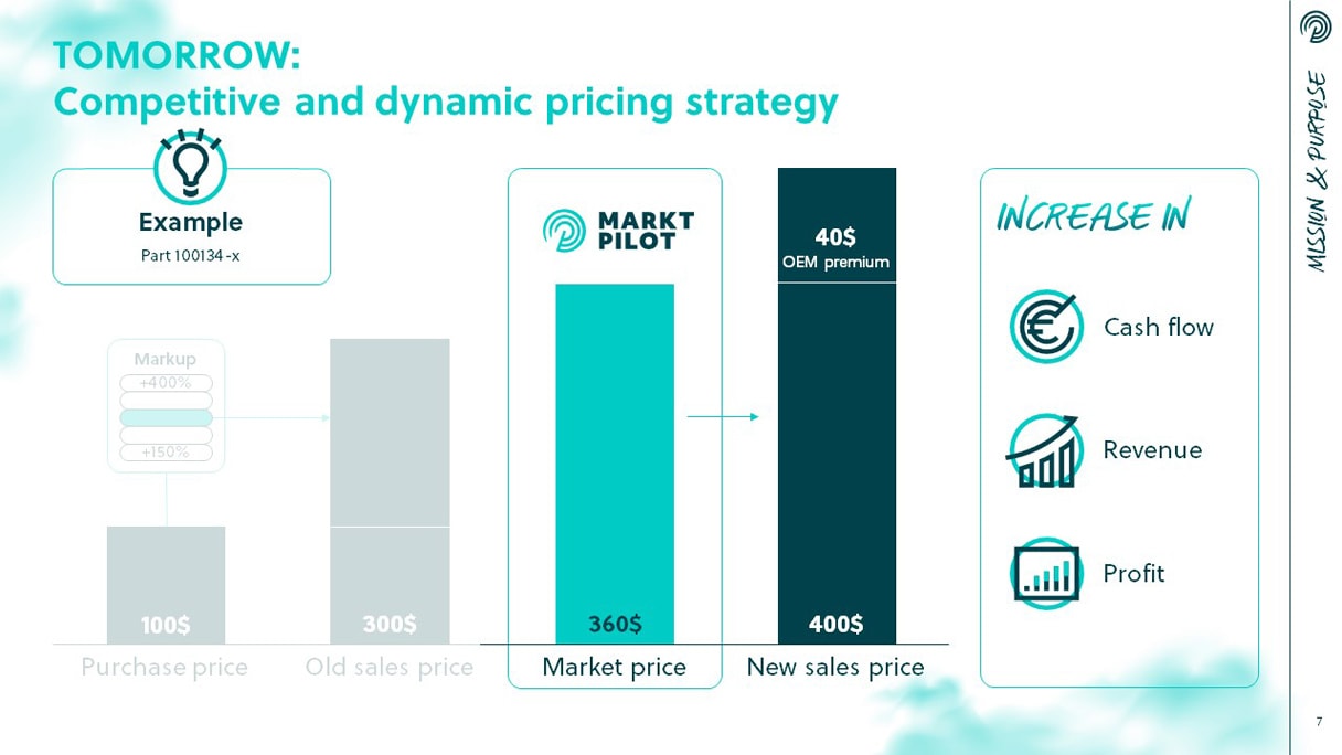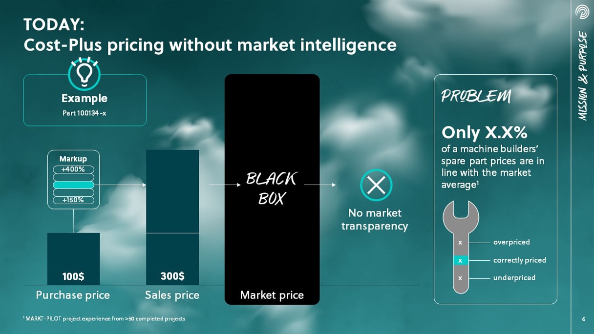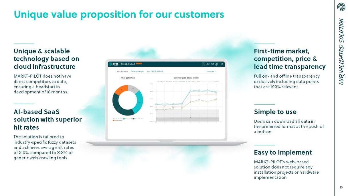 Markt-Pilot verspricht mit seinem Price-Radar Transparenz über den Markt für Ersatzteile im Anlagen- und Maschinenbau. Erstmalig lassen sich mithilfe der Software automatisch, aktuell und international Wettbewerber, Preise und Lieferzeiten vergleichen. Um Investoren für das Startup zu gewinnen, benötigte Markt-Pilot eine Pitch-Präsentation, die Fakten, Strategie und Wachstumspotenziale des Unternehmens, die Benefits des Produkts sowie Referenzen in prägnantem Design inszeniert.