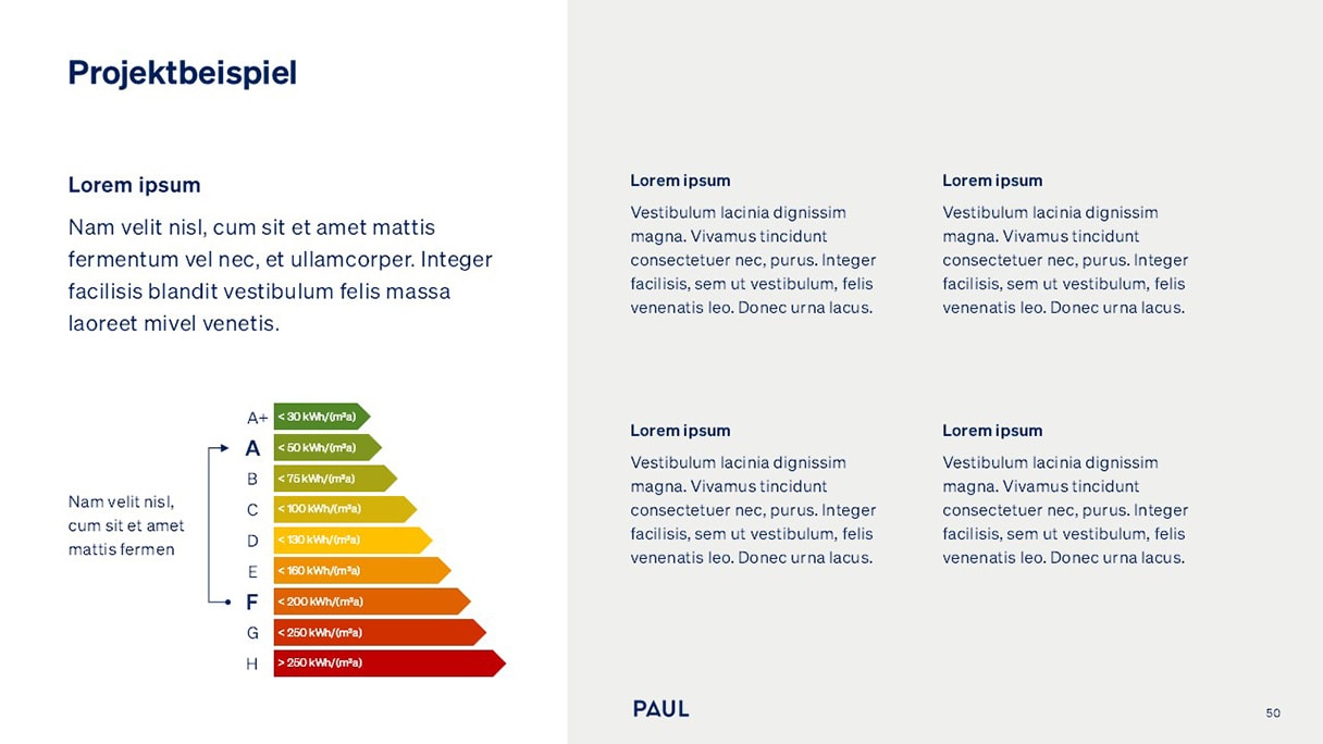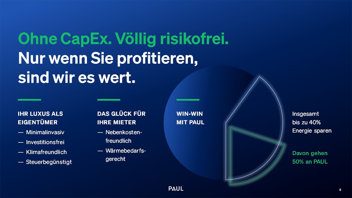 Für die innovative PAUL Tech AG, die die CO2-Emissionen von Gebäuden minimiert und durch AI-gesteuertes Heizen Immobilienwerte steigert, erstellten wir die Showpräsentation für einen 15 Minuten-Pitch.