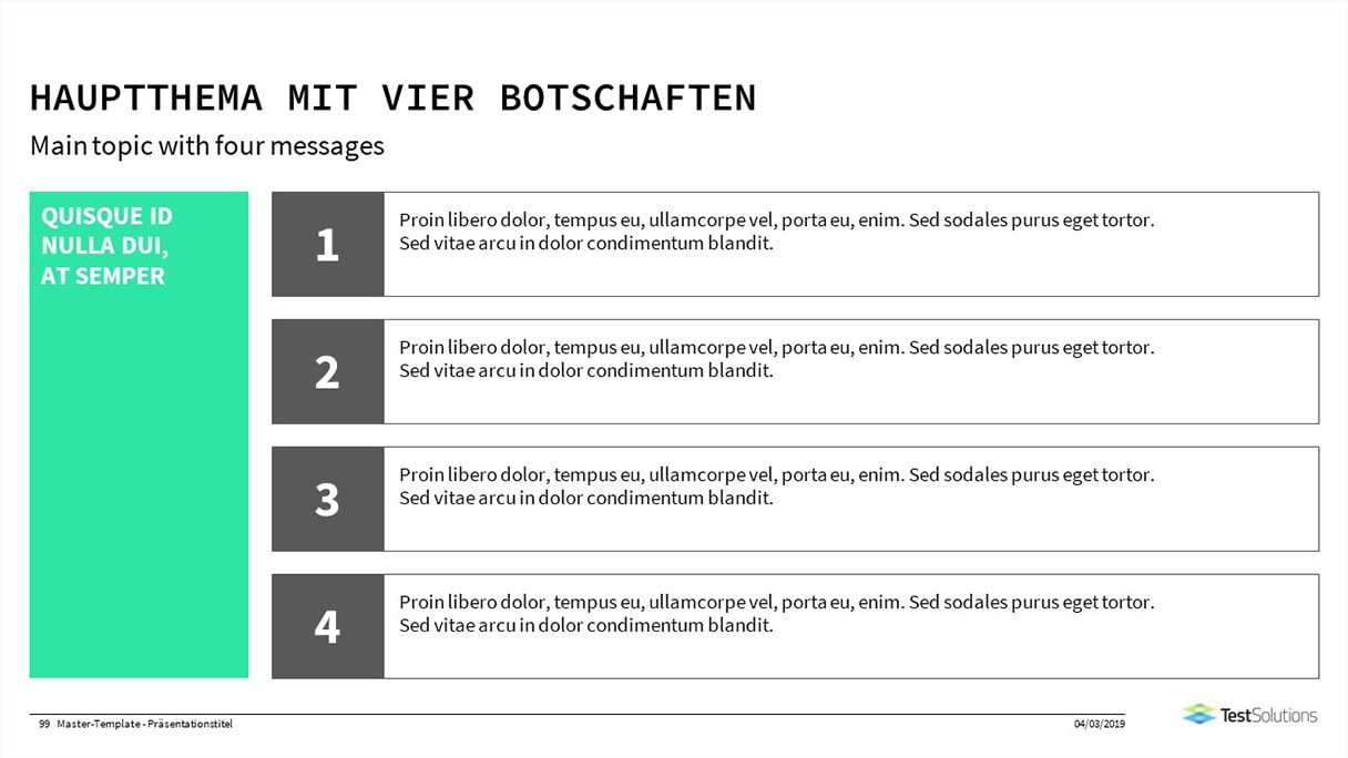 Im Rahmen der visuellen und strategischen Weiterentwicklung der Marke unterstützte K16 TestSolutions bei der Entwicklung einer neuen Corporate Identity, die den inhaltlichen Grundstein für die Unternehmenspräsentation bildet. Darüber hinaus gab K16 den Mitarbeitenden von TestSolutions mit einem Master und einer Folienbibliothek wichtige PowerPoint-Tools an die Hand, die ein einfaches und flexibles Gestalten der eigenen Folien erlauben. Diese legten den Grundstein für erste Corporate Design Elemente.