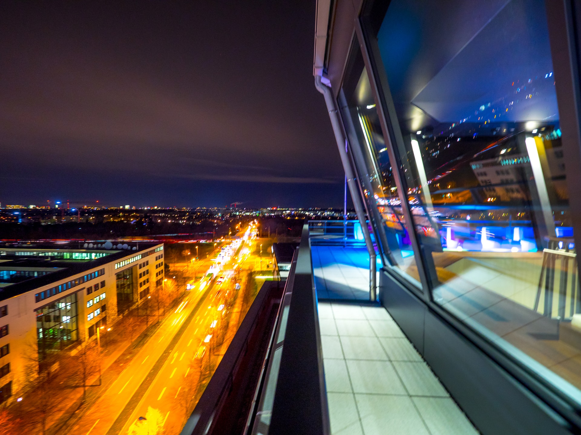 Etwas mehr Platz und mit etwa 5,6 Metern vor allem mehr Höhe bietet der Eventraum in der achten Etage. Für bis zu 120 Personen können hier Produktpräsentationen oder Partys abgehalten werden.