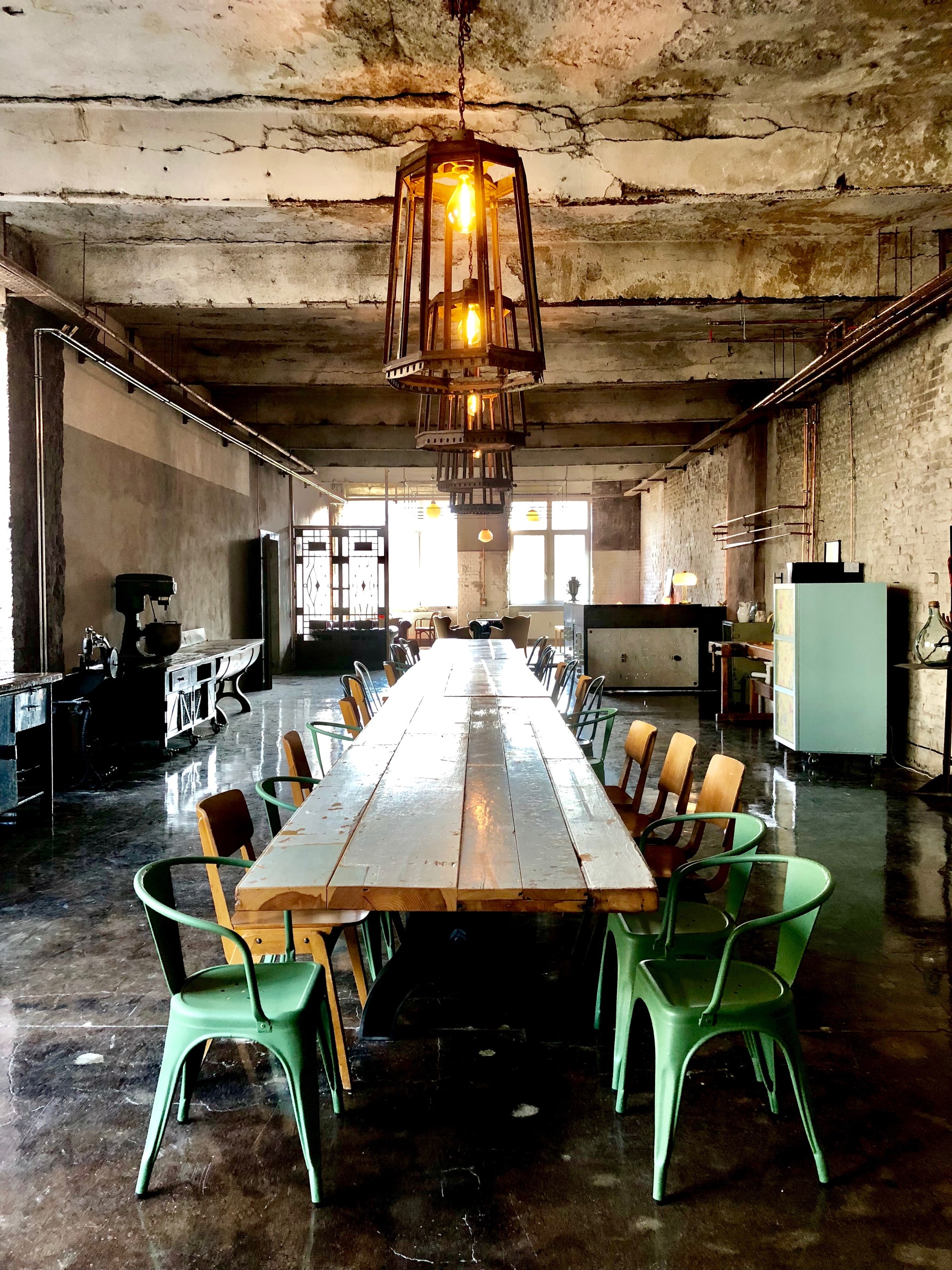 Für Pausen und Mittagessen bietet die Fabrik unter anderem eine offene Küche auf 116 Quadratmetern. Dort sitzen Sie – Achtung! – auf antiken Kirchenbänken oder stehen an einem Stehtisch aus einem umgebauten historischen Turnbarren. Buchen Sie die Kombi mit Wintergarten inklusive Kaminofen, haben Sie Platz für bis zu 60 Personen.