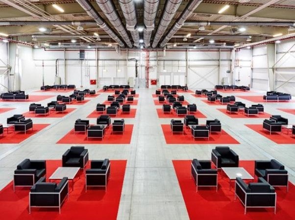 Die Halle umfasst ohne Bestuhlung bis zu 2.200 Gäste auf sagenhaften 4.000 Quadratmetern, lässt sich aber je nach Bedarf bereits ab 1.000 Quadratmetern mieten und durch Vorhänge vom übrigen Raum trennen.