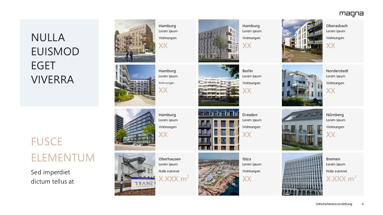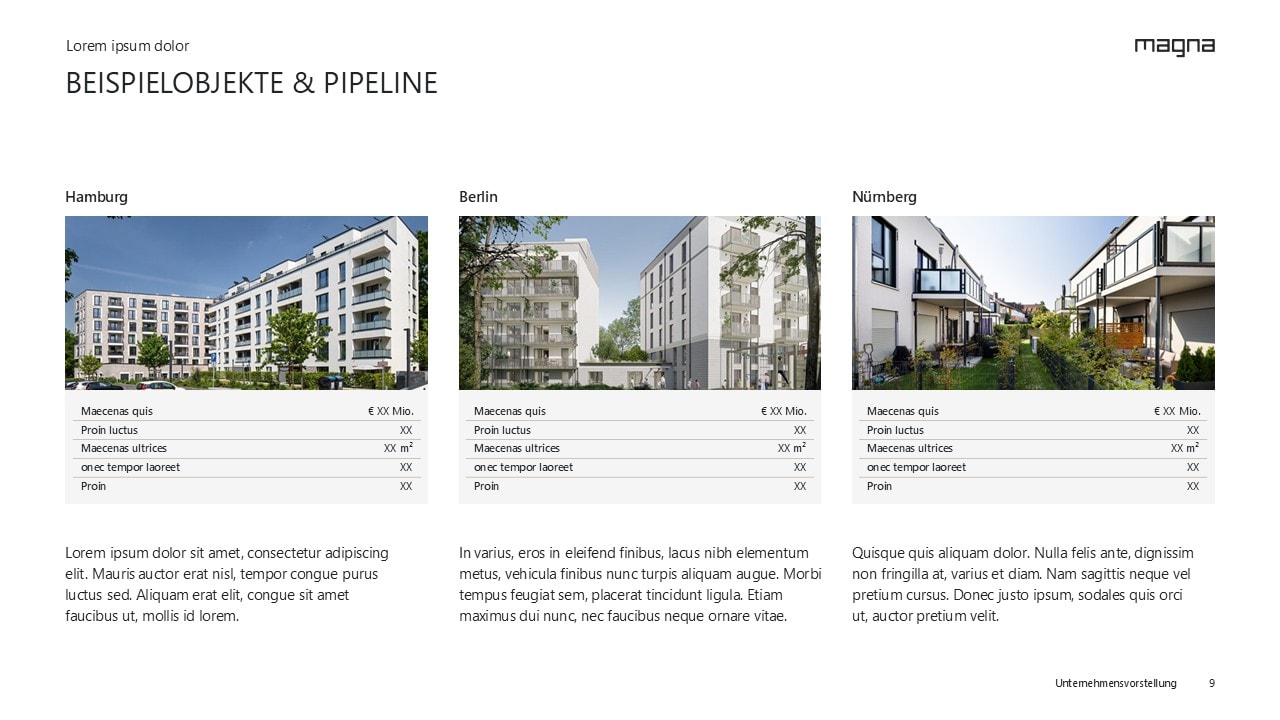 magna asset management, an independent real estate boutique based in Hamburg, came to us on recommendation after an unsatisfactory agency experience. Together, we developed a presentation that showcases magna asset management’s expertise through a clear storyline, can be flexibly adapted to different portfolio components, and visually fits the investment industry.